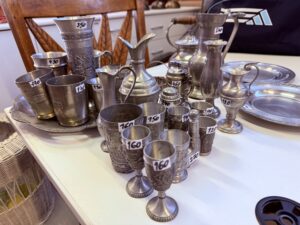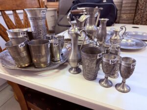 001 cínové zdobené kalichy, svícny , vázy, talíře atd -vše 95% cín s značkou