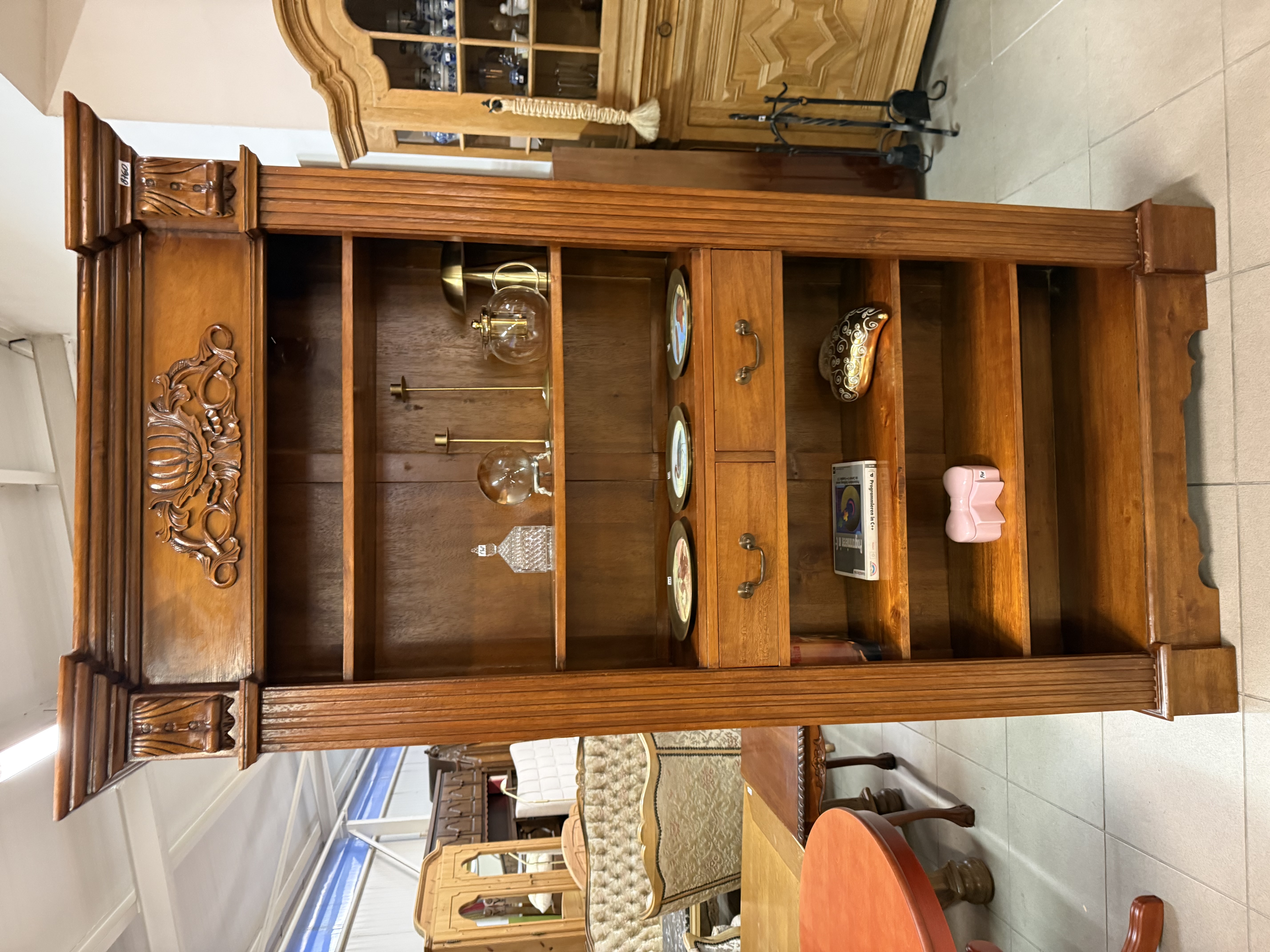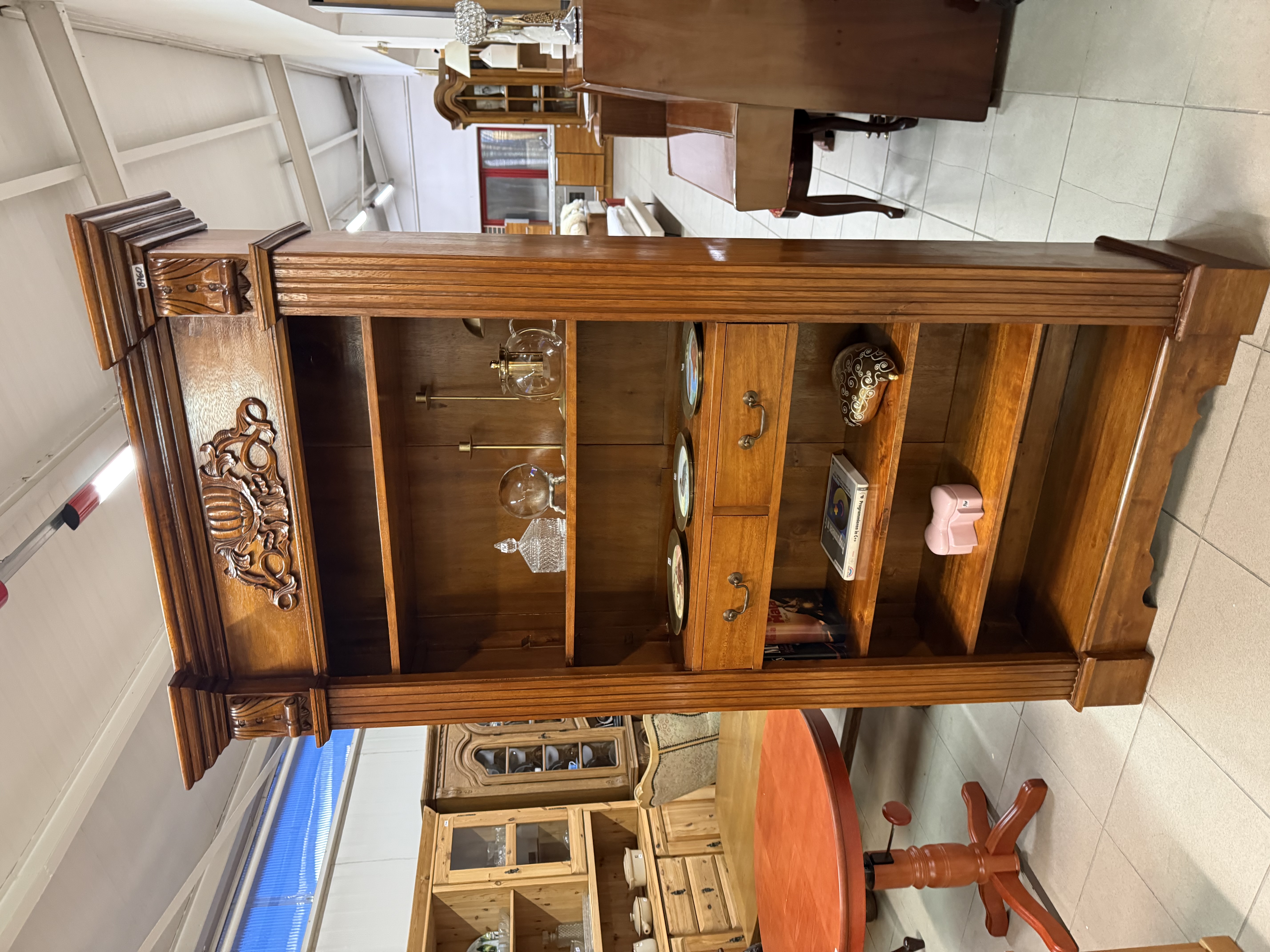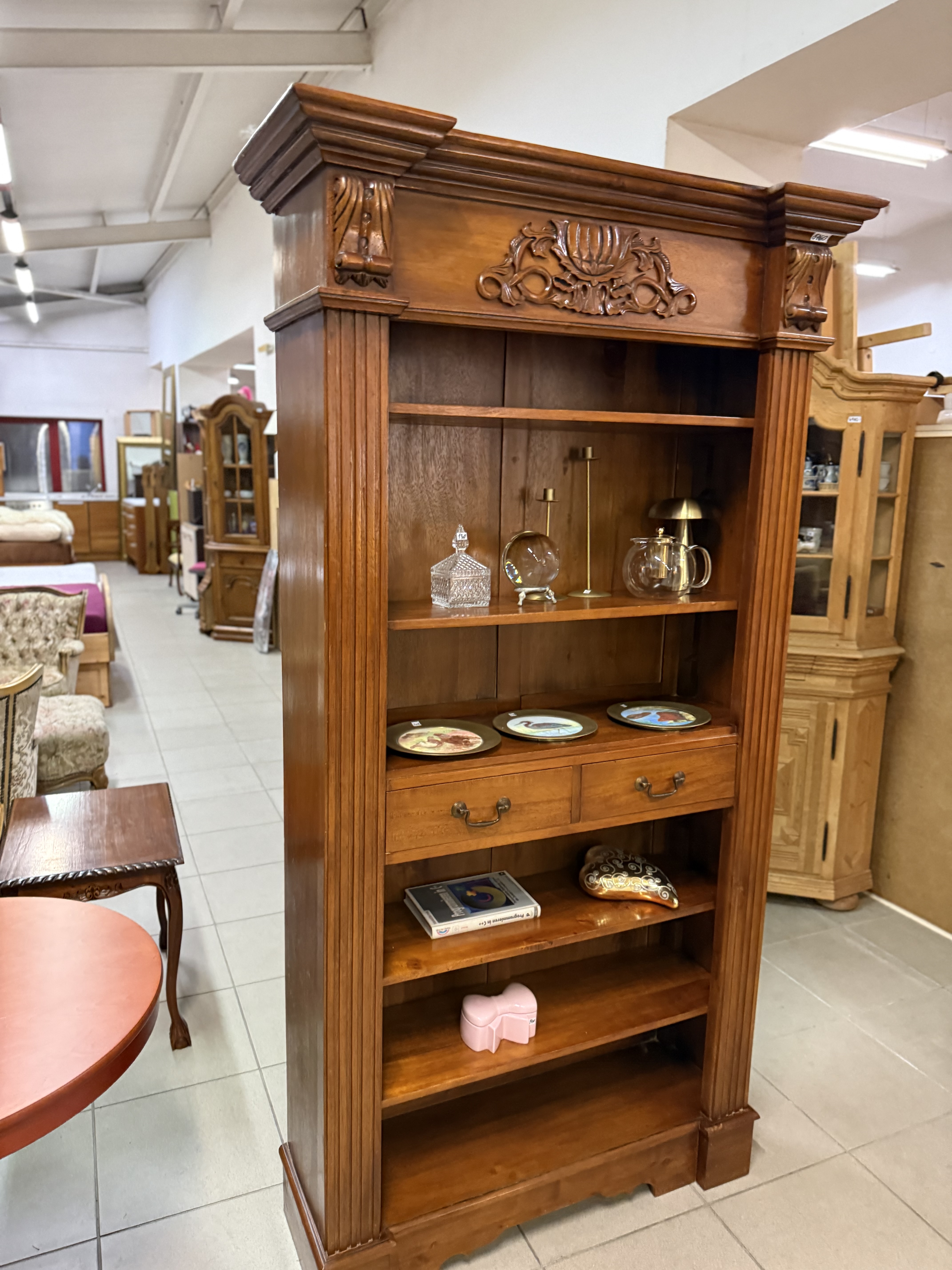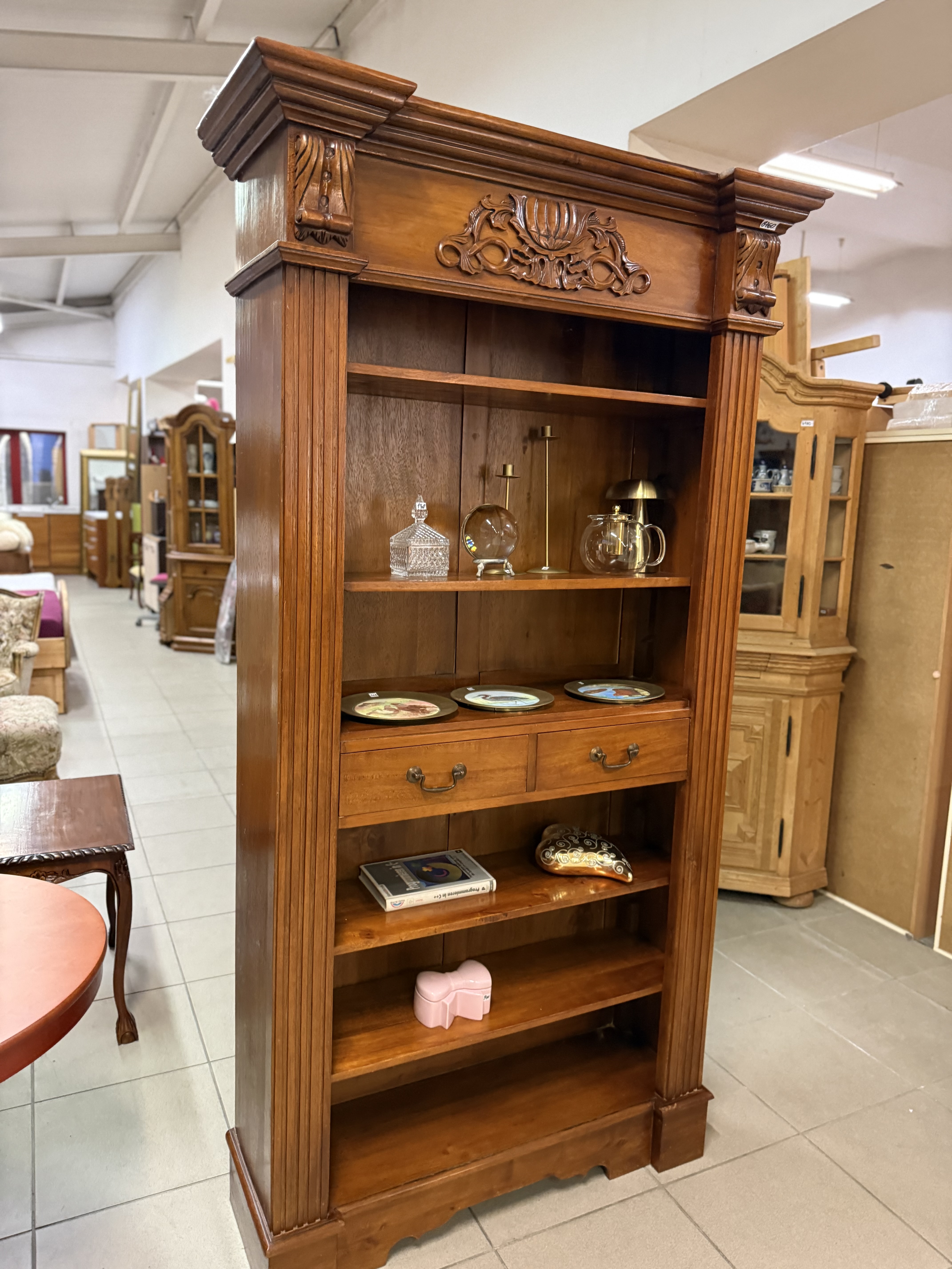 řezbovaná knihovna z masívu v neokoloniálním stylu se dvěma šuplíky 110 x 40 x 205cm...