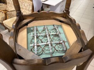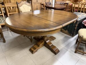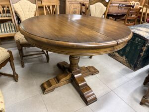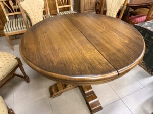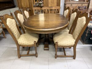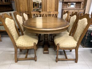 242 dubový jídelní stůl průměru 100cm,po rozl. 152cm,v78cm,+ 6pevných židlí za 8470Kč